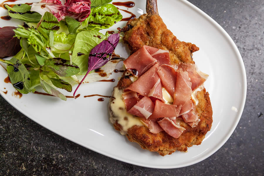 (Prime rib suíno empanado com molho de parmesão e presunto cru)