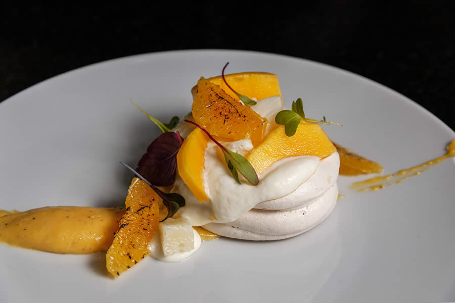 (Merengue com mascarpone, zabaione de maracujá e frutas amarelas)